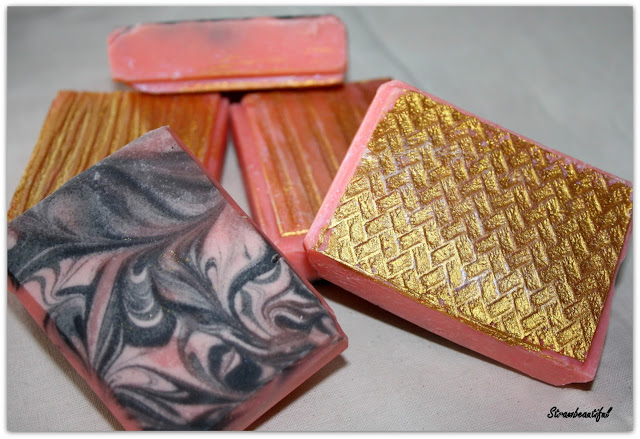Diese Seife kam in eine Kastenform aus Silikon und war auch die einzige, die eine Gelphase erleben durfte. Von dem grün, welches wir zusammen mit dem pink marmoriert haben, ist leider kaum etwas zu sehen. Trotzdem ist sie wunderschön geworden, erst recht mit dem Gold. Sie sieht ein bisschen so aus wie Kuchen :-)